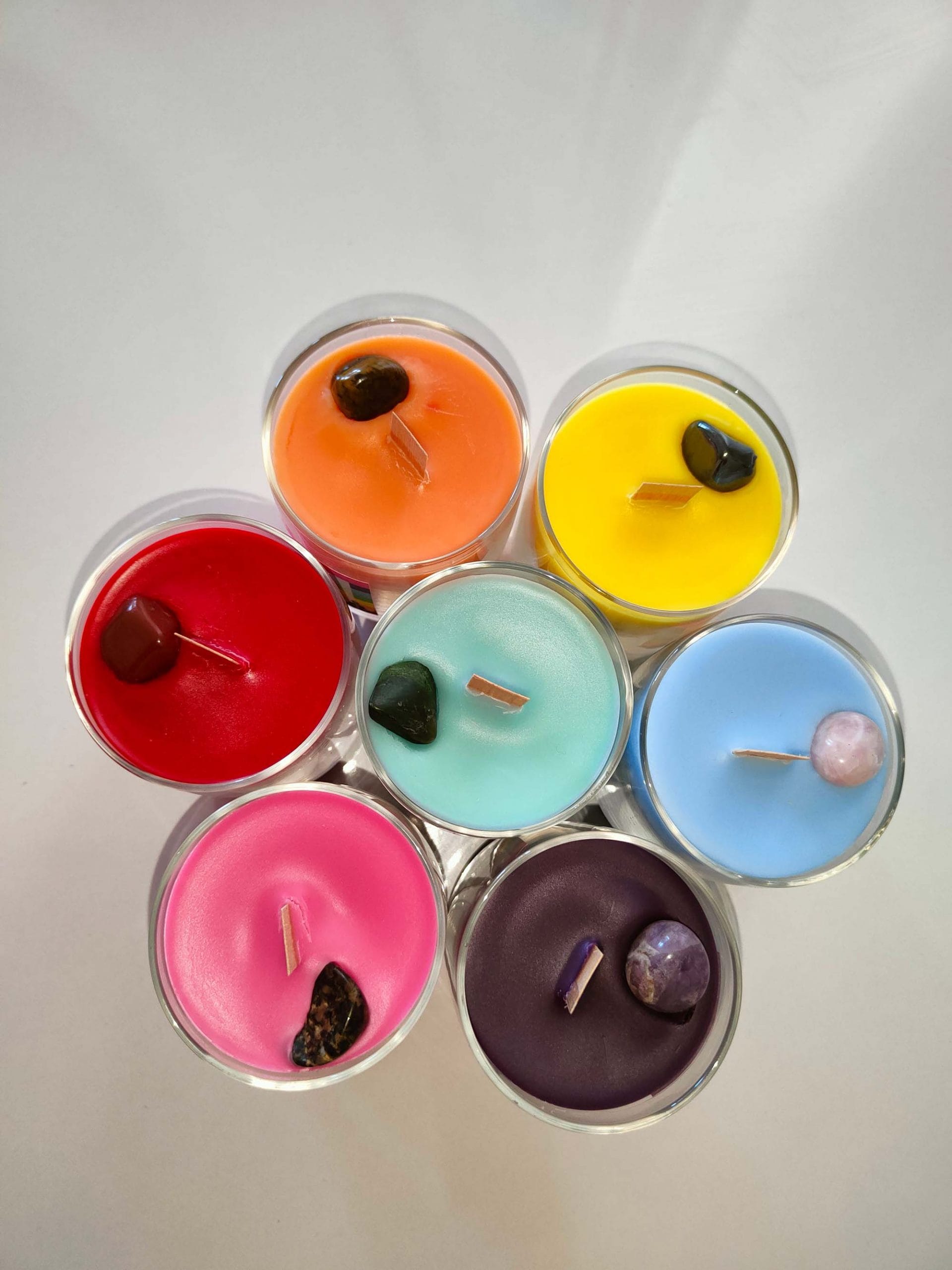Çakraların dengelenmesi için o çakraya ait renk, koku ve doğal çakra taşları bu mum serimizde bir araya gelmiştir. Bol şifalar!
