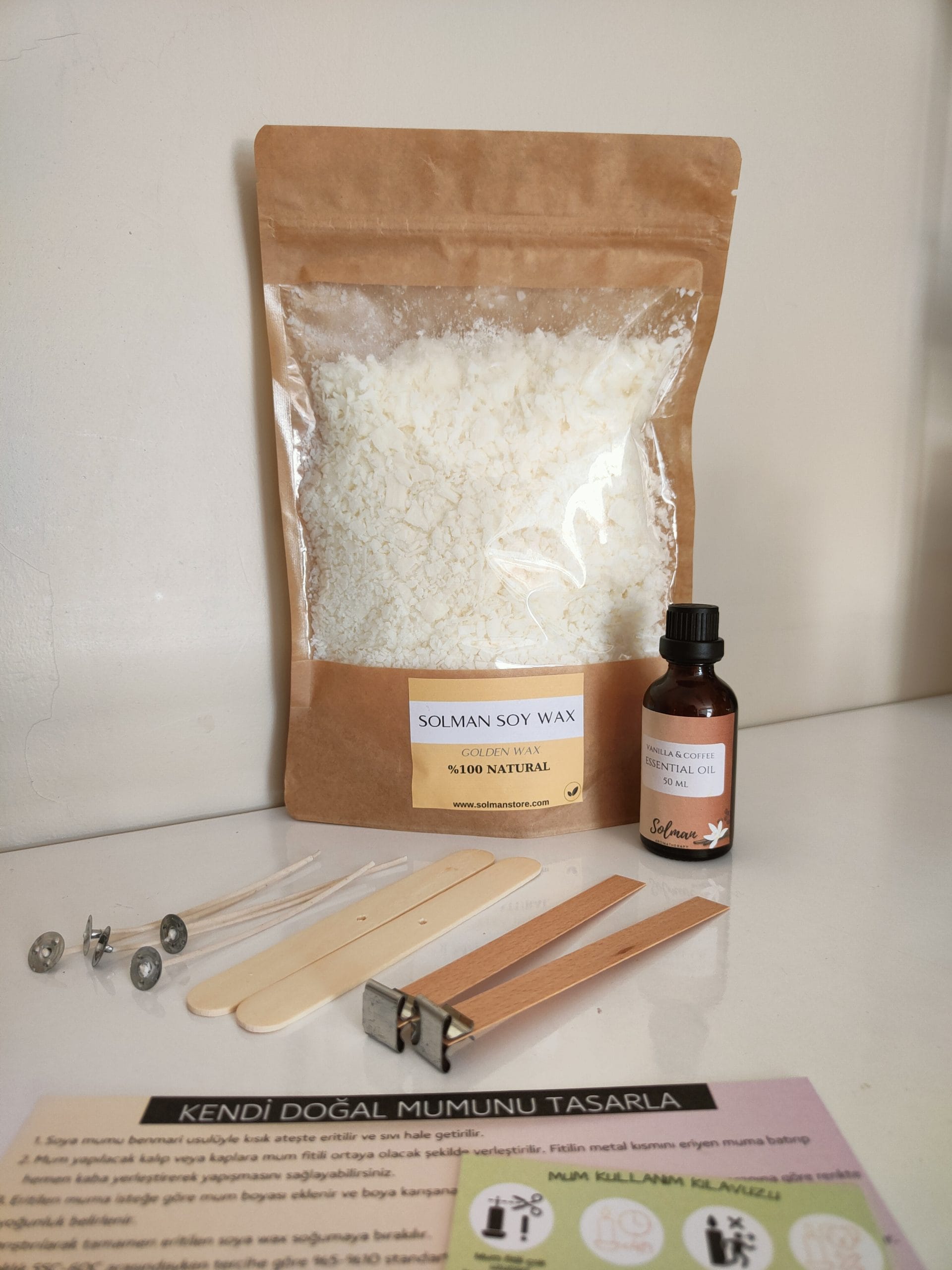 Ürün içeriği 500gr kraft paket natürel soya wax, 50ml vanilya-kahve mum esansı, 2 ahşap fitil ve sehpası, 5 pamuk fitil, 2 pamuk fitil sabitleme çubuğu, mum yapım kılavuzu ve mum kullanım kılavuzu şeklindedir. Doğal ve pürüzsüz mum nasıl yapılır? Mum yapmak için gerekli malzemeler nelerdir? Bu sorulara cevap bulabileceğiniz bir set ve nasıl mum yapılır anlatılan bir bilgilendirme mevcuttur. Koku tercihinizi soru cevap kısmından bize ulaşarak değiştirebilirsiniz. Soya wax, 0 doğal içerikli olup, içerisinde herhangi bir kimyasal katkı maddesi yer almaz. Kremsi yapıda olup, rengi kırık beyaz, açık sarı şeklindedir. Natürel kokudadır, farklı bir koku içermez. Soya wax, soya fasülyesinin yağından elde edilen doğal bir mum yapım malzemesi olup, sağlıklı ve pürüzsüz mum yapımları için tercih edilir. Yanma süresi diğer kimyasal hammaddelere göre daha uzun sürelidir. Havayı kirletmez, doğa dostudur.