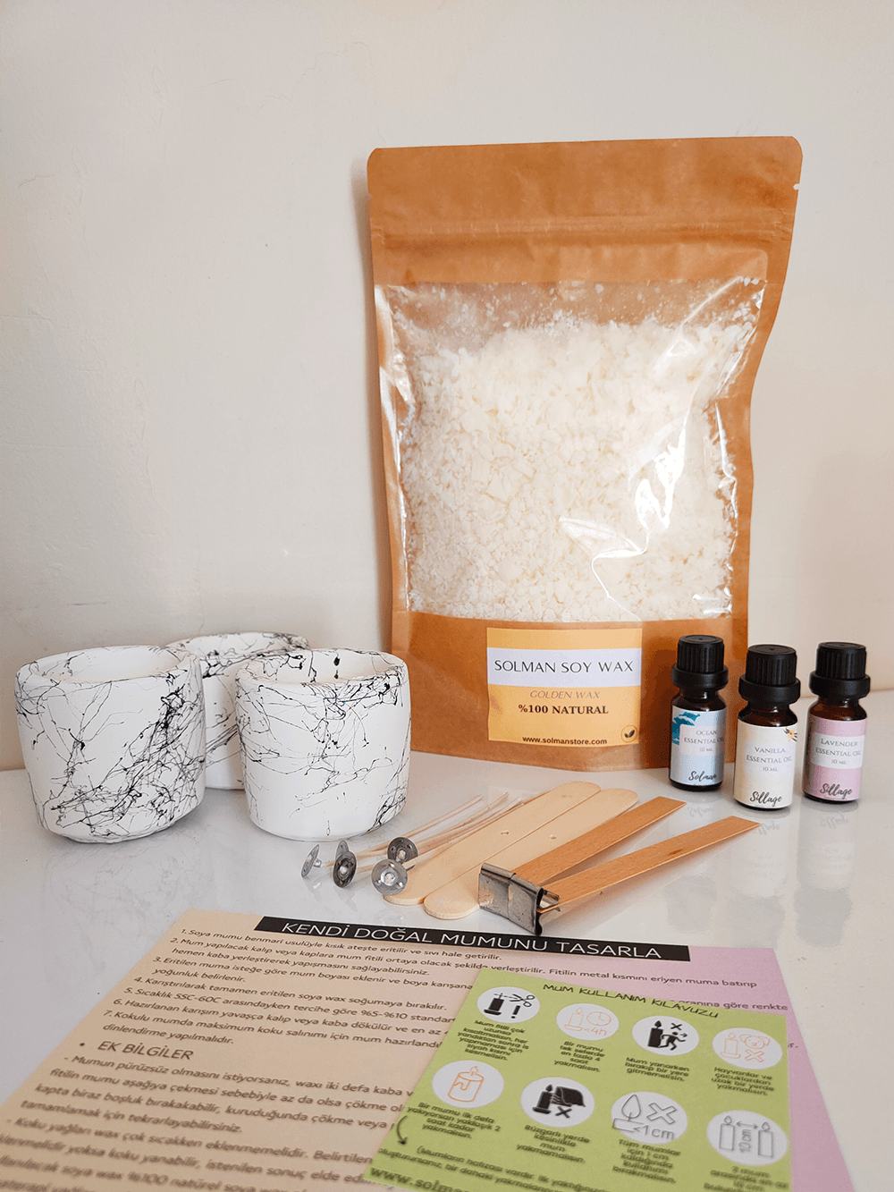 Ürün içeriği 500gr natürel soya wax, 10ml vanilya mum esansı, 10ml lavanta mum esansı, 10ml okyanus mum esansı, 3 adet mum dolumuna uygun beton kap, 2 ahşap fitil ve sehpası, 5 pamuk fitil, 2 pamuk fitil sabitleme çubuğu, mum yapım kılavuzu ve mum kullanım kılavuzu şeklindedir. Doğal ve pürüzsüz mum nasıl yapılır? Mum yapmak için gerekli malzemeler nelerdir? Bu sorulara cevap bulabileceğiniz bir set ve nasıl mum yapılır anlatılan bir bilgilendirme mevcuttur. Koku tercihinizi soru cevap kısmından bize ulaşarak değiştirebilirsiniz. Soya wax, doğal içerikli olup, içerisinde herhangi bir kimyasal katkı maddesi yer almaz. Kremsi yapıda olup, rengi kırık beyaz, açık sarı şeklindedir. Natürel kokudadır, farklı bir koku içermez. Soya wax, soya fasülyesinin yağından elde edilen doğal bir mum yapım malzemesi olup, sağlıklı ve pürüzsüz mum yapımları için tercih edilir. Yanma süresi diğer kimyasal hammaddelere göre daha uzun sürelidir. Havayı kirletmez, doğa dostudur.