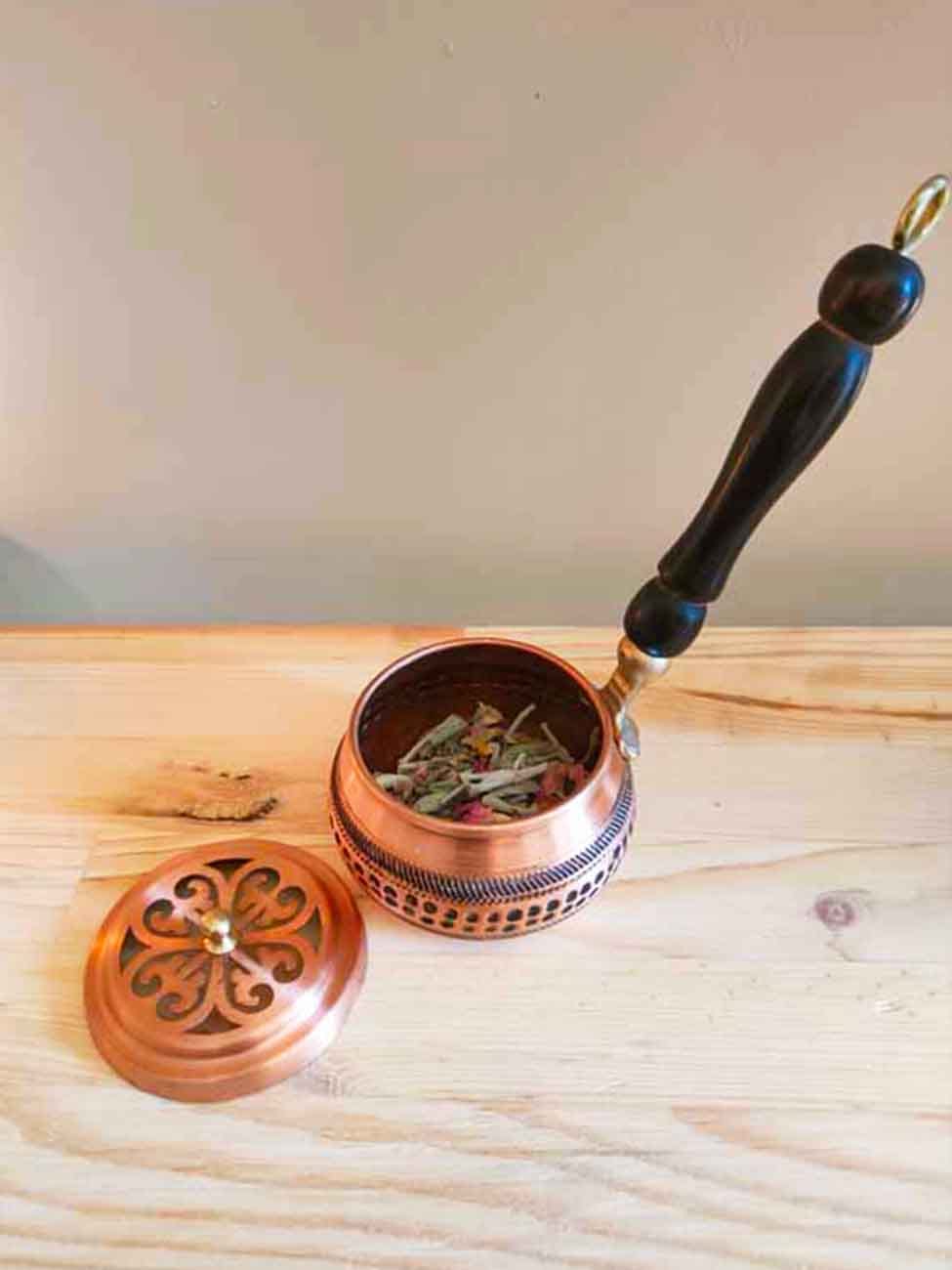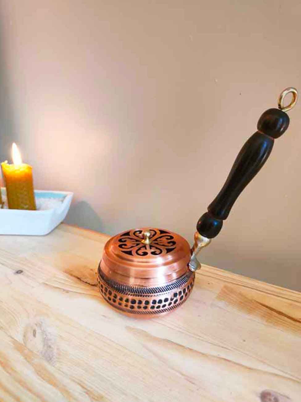 Ahşap Kulplu Bakır Reçine Bitki Tütsülük – Cadı Kazanı (Ada Çayı Tütsü Kabı)