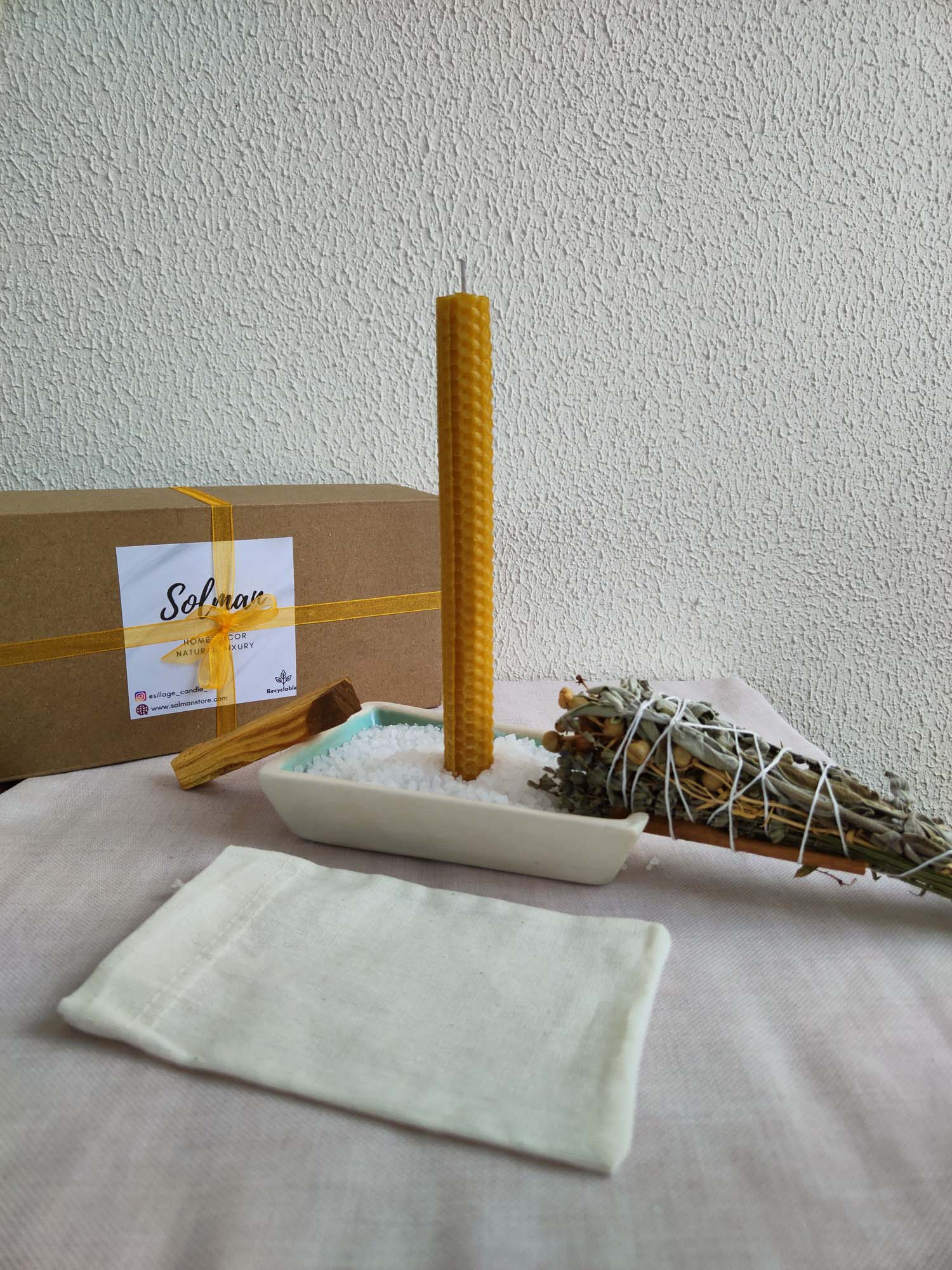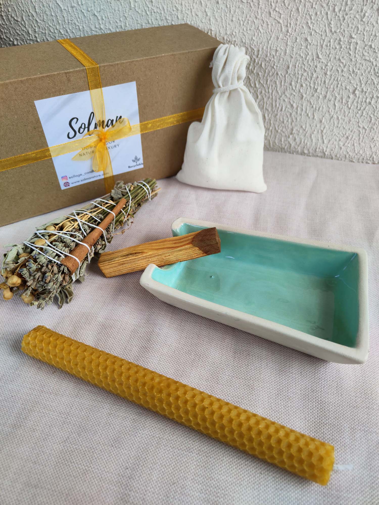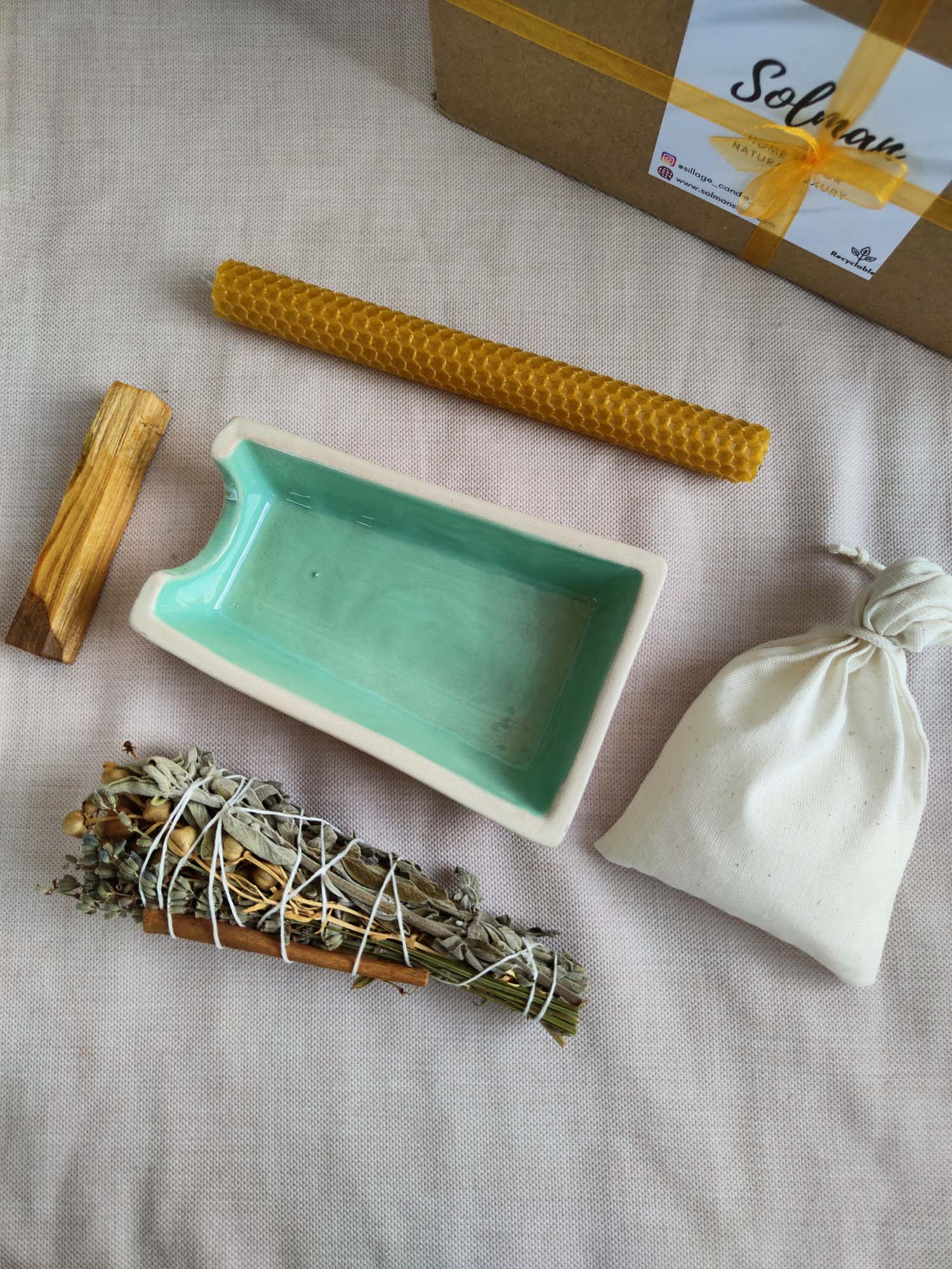 Ürün içeriğinde 1 adet tütsü tabağı, 1 adet adaçayı lavanta üzerlik otu tütsü demeti, 1 adet Peru menşeili orijinal Palo Santo ağaç tütsü, 1 adet 20×2 cm doğal Bal Mumu, 1 adet bez torba ve içerisinde kaya tuzu bulunmaktadır.