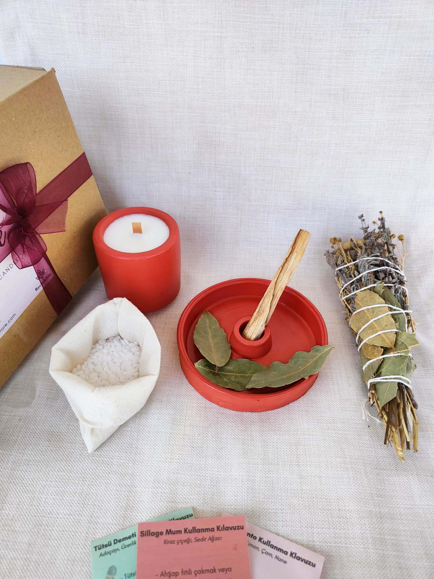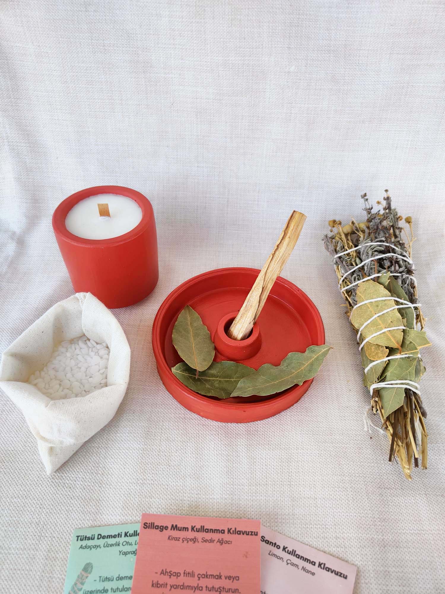 Ürün İçeriği: 1 adet el yapımı beton tütsülük, 1 adet beton soya mumu, 8-10gr Palo Santo tütsüsü, Adaçayı-Üzerlik Otu-Lavanta’dan oluşan enerji tütsüsü, Defne Yaprağı ve Kaya Tuzu’dur.