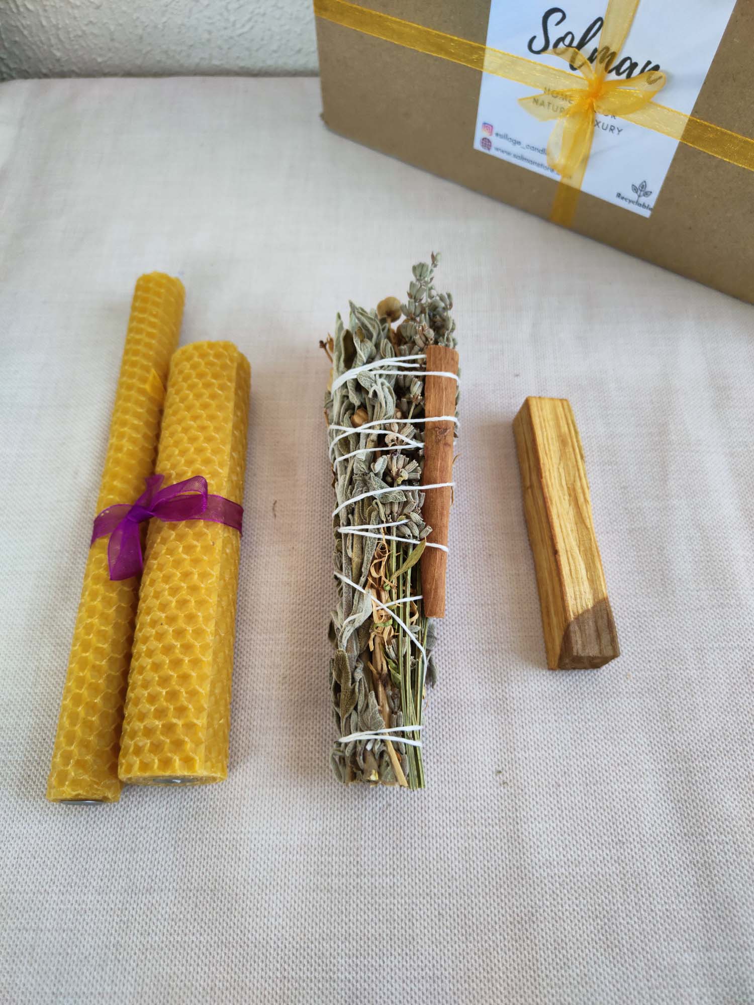 Enerji alanınızı temizlemek ve yeni güzel enerjilere yer açmak için kullanılan en güzel malzemeler bir araya getirilmiştir. Palo santo, Peruda yetişen ağaçtan elde edilen nane, çam ve limon aromalı b, r tütsüdür. Hem ruhsal hem de fiziksel olarak arınmayı sağlar. Kokusunun ve tütsülendiği alanın insan üzerinde birçok pozitif etkisine inanılır. Bal mumu, arılar tarafından oluşturulan polen kokulu doğal bir mumdur. Enerjisine eski zamanlardan beri çok inanılır ve birçok ritüelde yer alır. Adaçayı, lavanta, üzerlik otu ve tarçından oluşan demet tütsü de ise her birinin ayrı faydasından yararlanılır. Ortamın enerjisini temizleme, nötrleme, bolluk ve bereket katma gibi etkisi kişiye rahatlama getirir. Ürün içeriğinde 1 adet demet tütsü, 1 adet Palo Santo, 1 adet 20×2 cm Bal Mumu, 1 adet 15×3 cm Bal Mumu yer almaktadır.