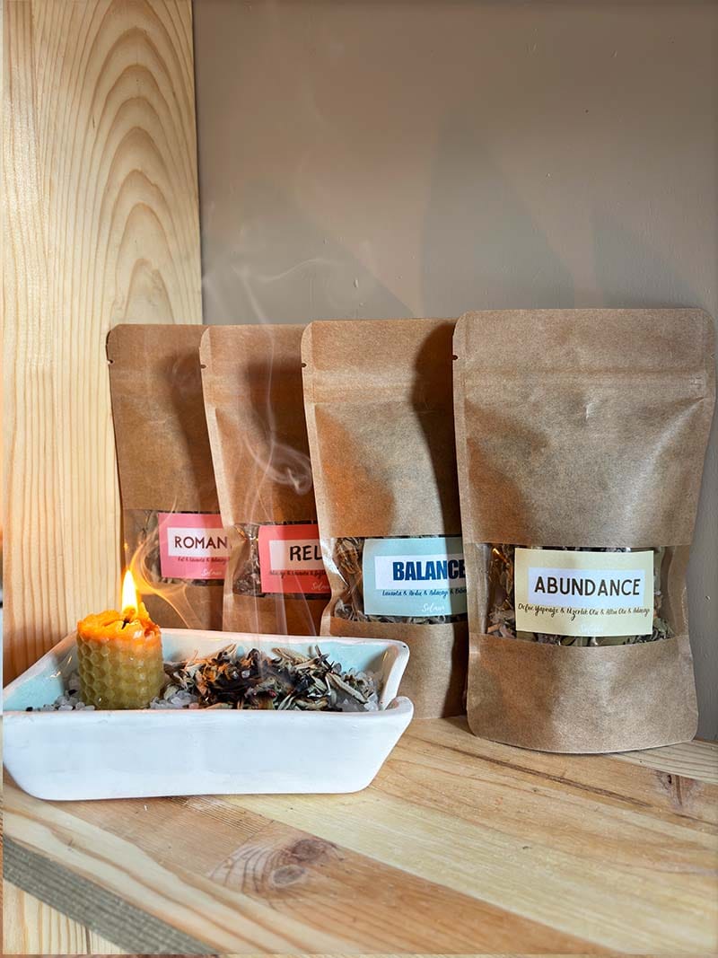- Adaçayı lavanta, üzerlik otu, gül yaprakları, biberiye, palo santo, altın otu gibi tütsülerle harmanlanan 4 farklı tütsü seçeneği mevcuttur.